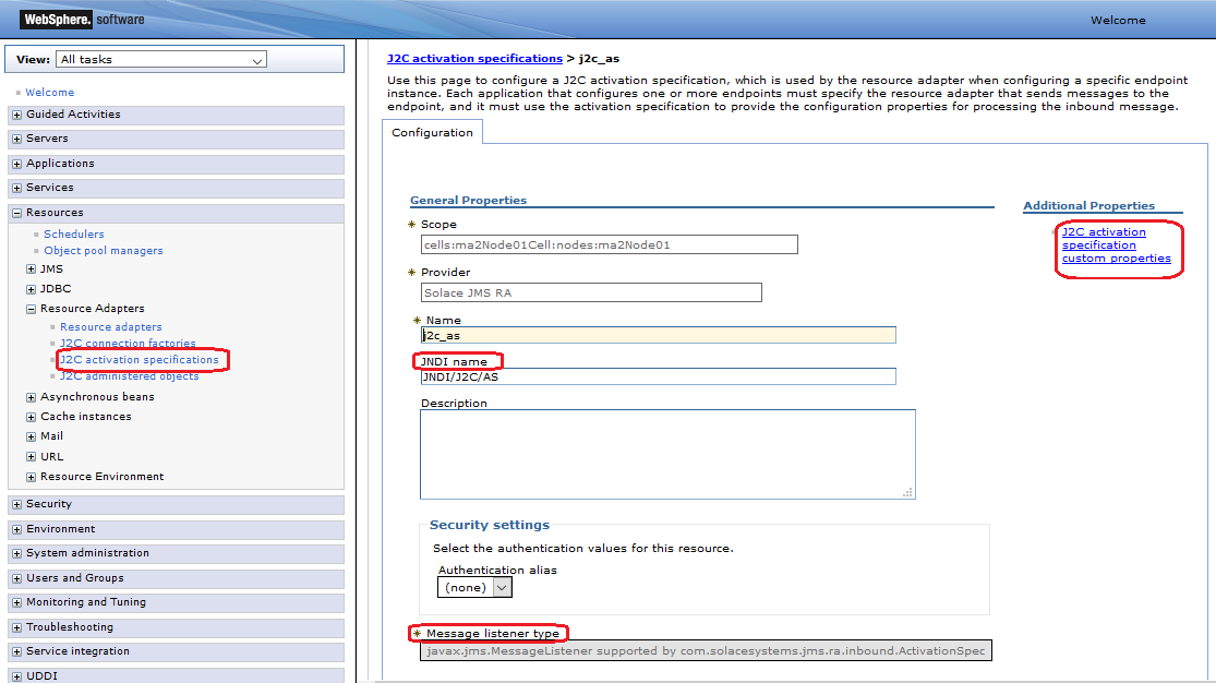 J2C activation specification | j2c_as | JNDI/J2C/AS | A J2C entity used to initialize a Message Driven Bean and to bind it to a Solace JMS destination using the Solace implementation of javax.jms.MessageListener (For Inbound messaging) |